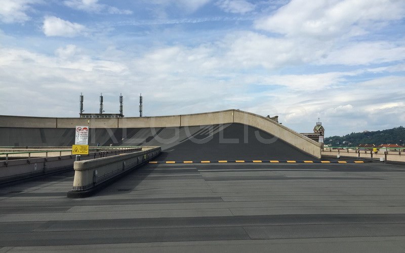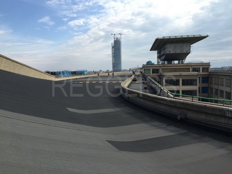 An incredible car track on the roof terrace of a building with amazing banked curves of 1 km . The access of cars is by helical ramp.